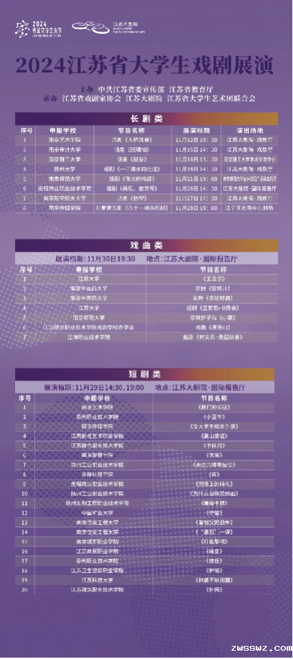 本次戏剧展演以“成就戏剧梦想 一展青春风华”为主题,自6月份启动以来,共收到省内62所高校申报的96部作品。其中,26所高校的8部长剧、20部短剧、7部戏曲作品入围终评展演。