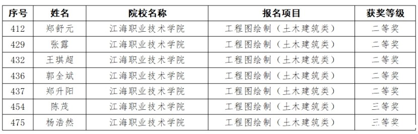 文化创意学院荣获工程图绘制(土木建筑类)赛项个人二等奖5项、三等奖2项。